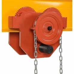 Geared Trolley features a chain gear drive for precise trolley/hoist positioning. This unit is not free-floating on the I-beam. Hanging chain length is 10 feet.