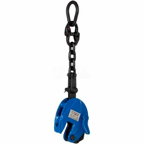 Made of steel for long lasting durability. Easily lift plate material straight up in vertical positions. Lifting eye and chain provide greater versatility. Meets ASME B30.20 specifications. Color finish is Blue. Capacity is 1,000 lbs. Max plate thickness is0.6″. Throat depth is 1-1/2″. Bail opening is 2-1/4″.